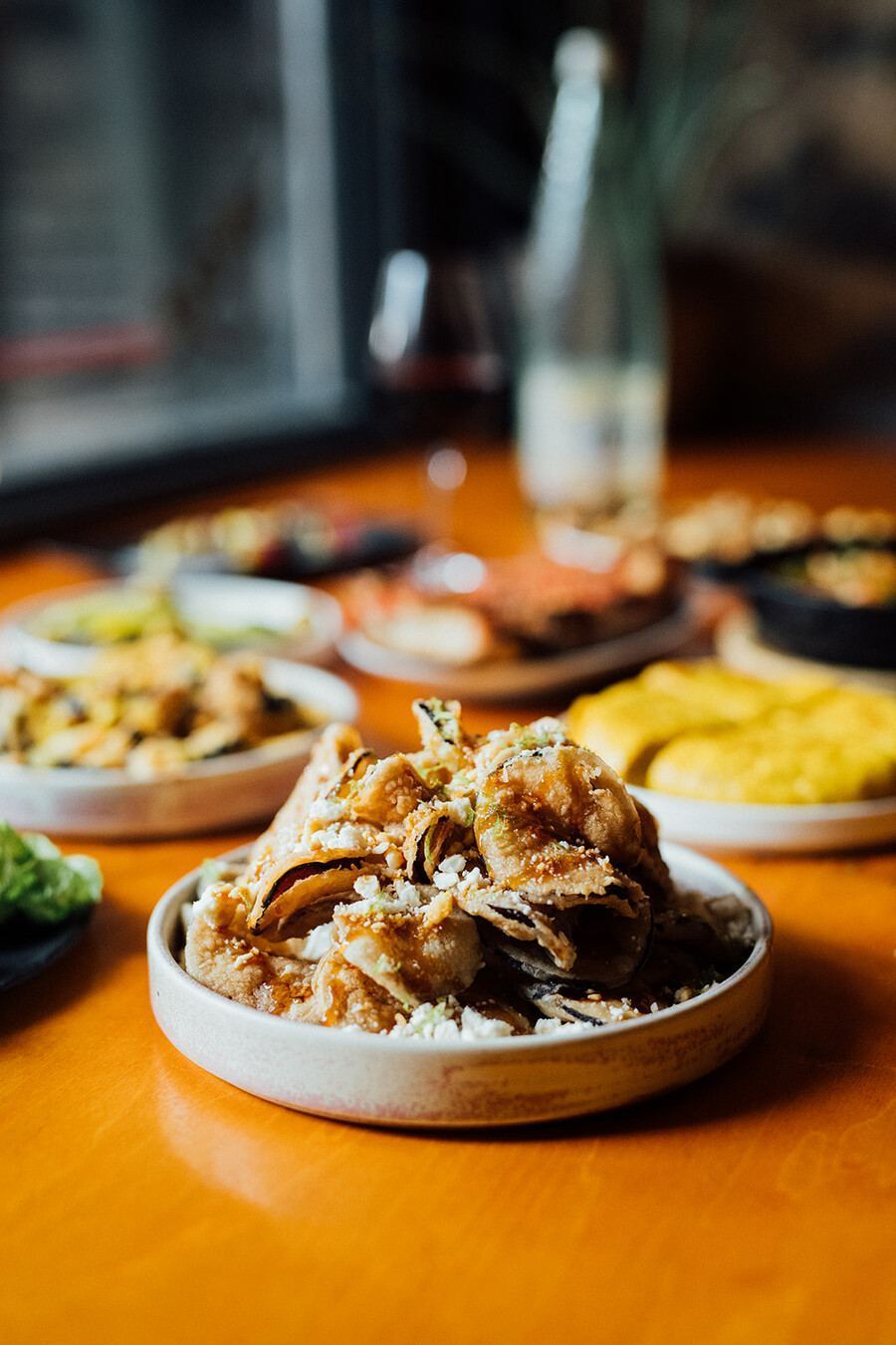 The Berenjenas Fritas deliver a satisfying crunch with thinly sliced marinated eggplants, garnished with yogurt, buckwheat honey, feta cheese, and lemon zest.