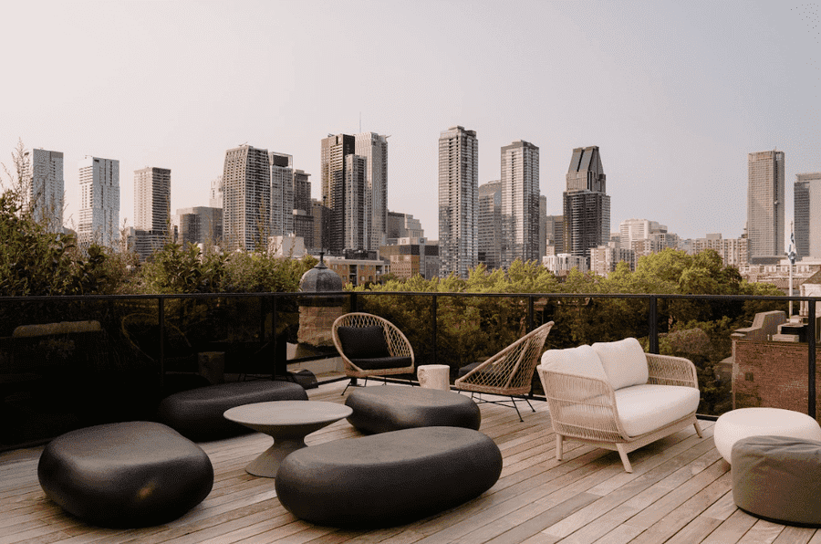 The hotel will soon feature a 2,000-square-foot rooftop bar and lounge with panoramic views of downtown Montreal. Designed as an open-air living room, the terrace will be a place to read, enjoy a cocktail, or share a meal in a relaxed atmosphere. The menu, reflecting Groupe Grinder's convivial spirit, will include a selection of hot and cold small plates, grilled dishes, and shared plates.