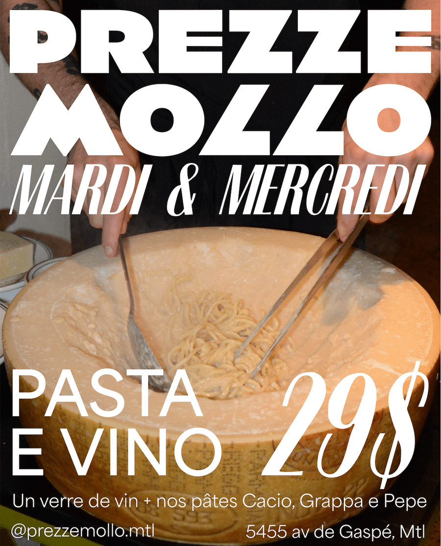 Prezze Mollo vous invite à savourer son offre Pasta e Vino tous les mardis et mercredis. Pour 29$, profitez d'un délicieux plat de pâtes Cacio, Grappa e Pepe, servi directement dans une meule de fromage, accompagné d'un verre de vin (choix du sommelier).