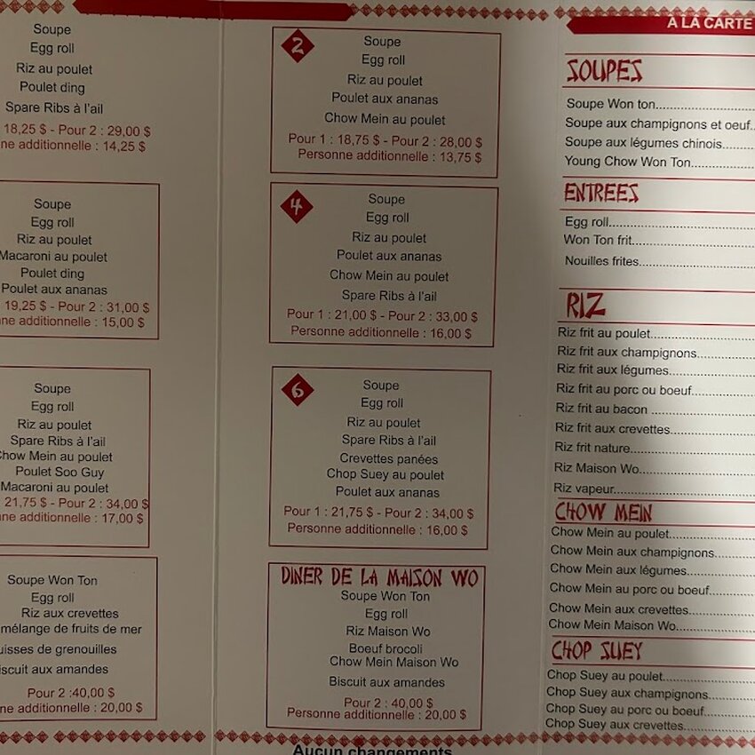 Bonjour j ai déjà fait un commentaire disons quelque peu négatif donc dernièrement j ai réessayer le no 6 pour 2 je me suis dit peut être que c est meilleur Mais finalement Non soupe qui a aucun goût egg roll froid spare rond très dure poulet a l ananas & crevettes papillon encore plus de panure tu cherche le poulet & les crevettes dans le gros paquet de panure La vraiment c est fini avec ce restaurant Vraiment dommage Je ne sais pas ce qui se passe à ce restaurant